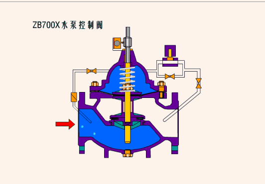 ⑦. 700X水泵控制閥當(dāng)水泵工作閥門向下游供水時(shí),電磁導(dǎo)閥全開,針閥調(diào)到適當(dāng)開度,上游水經(jīng)過針閥,導(dǎo)閥,單向閥進(jìn)入主閥控制室,經(jīng)電磁導(dǎo)閥流出,此時(shí)主閥控制室壓力保持主閥處于合適開度,保持下游正常供水。700X水泵控制閥當(dāng)水泵停止工作時(shí),電磁導(dǎo)閥先關(guān)閉,主閥停止排水,主閥室壓力升高,主閥開始關(guān)閉,當(dāng)關(guān)閉90%時(shí),主閥上部行程開關(guān)輸出停泵信號(hào),水泵停止運(yùn)轉(zhuǎn),此時(shí),主閥下游水經(jīng)過單向閥進(jìn)入主控制室,控制室壓力升高,主閥關(guān)閉。
