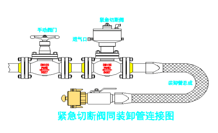 ●緊急切斷閥連接示意圖:手動氨用截止閥通常保持常開狀態(tài),其作用是防止切斷閥出現(xiàn)損壞或者更換維修再關閉的手動閥門,另一端與金屬軟管,快速接頭,手動閥門連接。